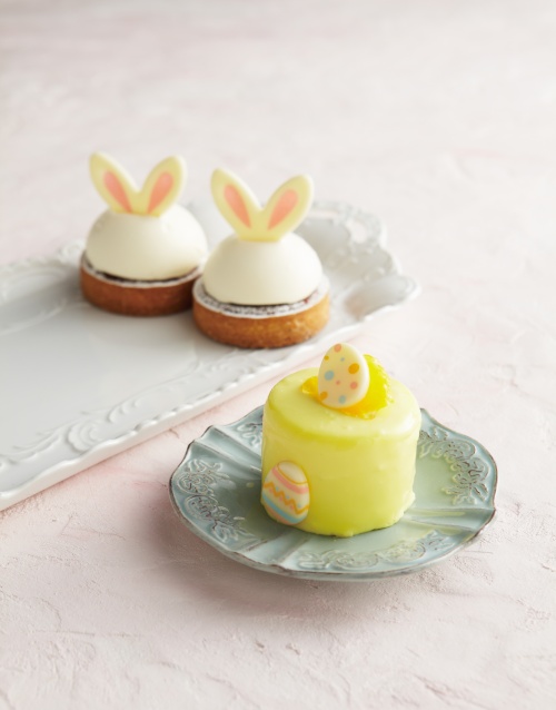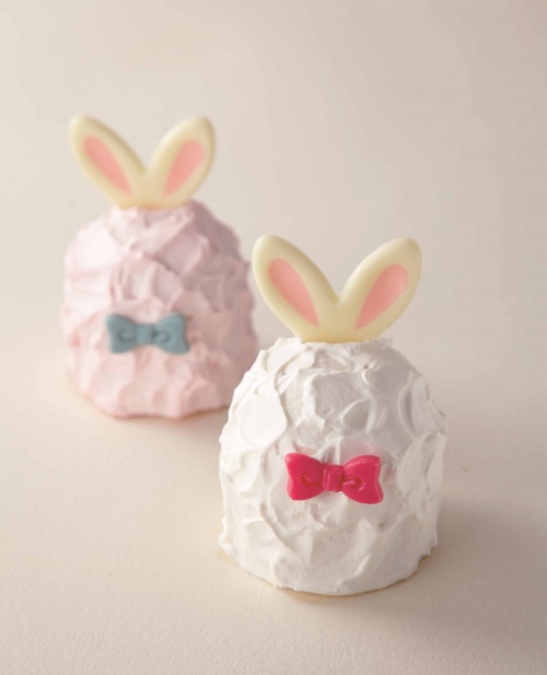 ミニサイズのアントルメやプチガトーに飾り付けることで、手軽にウサギをモチーフにした可愛らしいケーキを作ることができます。